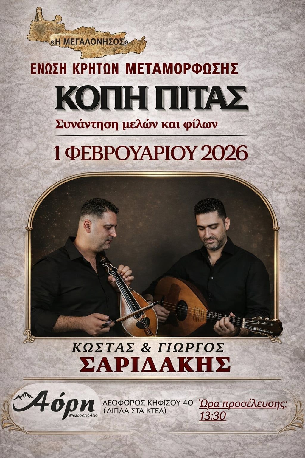 Σας καλούμε τη Κυριακή 1 Φεβρουαρίου (μεσημέρι) και ώρα 13:30 στο Κρητικό Κέντρο ΑΟΡΗ ΜΕΡΤΖΑΝΗΣ, Λεωφόρος ΚΗΦΙΣΣΟΥ 40 δίπλα στα ΚΤΕΛ. Κόβουμε την πίτα μας και διασκεδάζουμε με το συγκρότημα των Κώστα και Γιώργου Σαριδάκη !!!