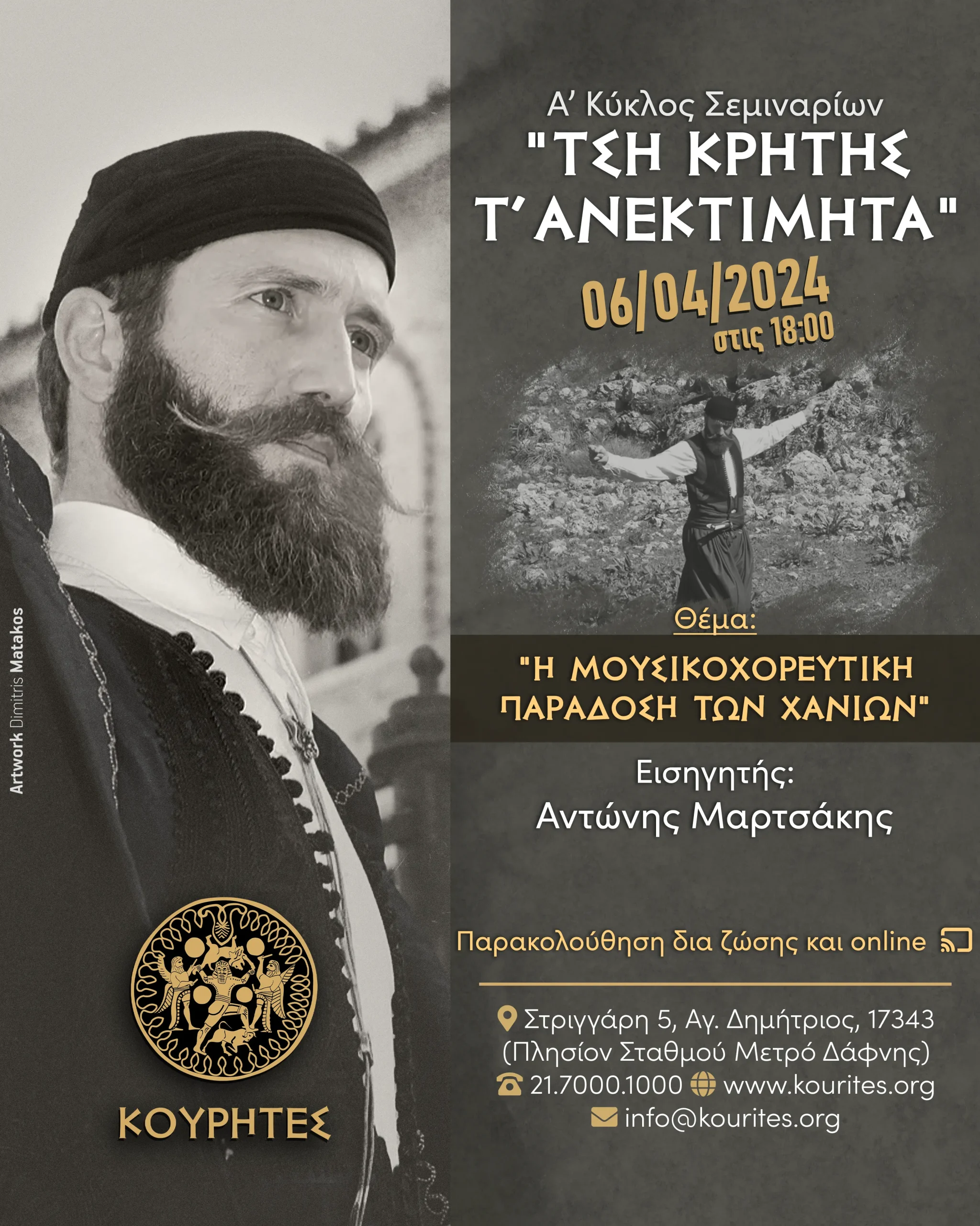 ο Σάββατο 6 Aπριλίου 2024 στις 18:00 θα διεξαχθεί το έκτο σεμινάριο του κύκλου σεμιναρίων «Τση Κρήτης τ’ ανεκτίμητα» με θέμα «Η μουσικοχορευτική παράδοση των Χανίων» με εισηγητή τον Αντώνη Μαρτσάκη.